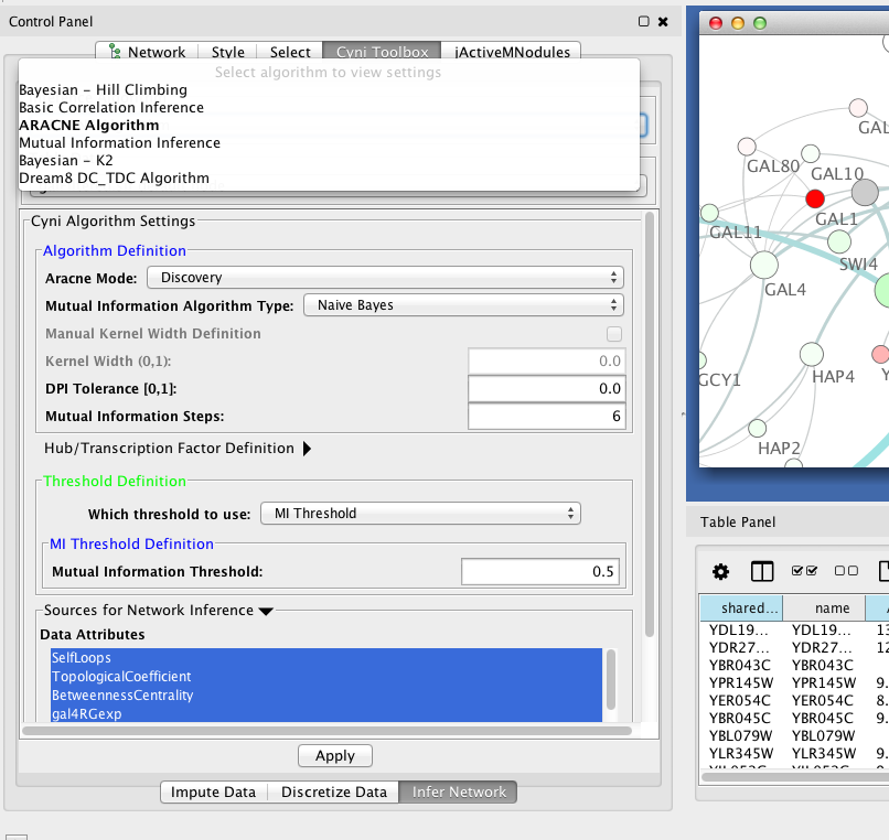 The Cytoscape app Cyni Toolbox puts together several tools that allow infering networks from biological data. Each of the tools can be used independently or together to perform several tasks. The goal of Cyni is to make network inference more accessible to biologists by providing user-friendly solution as well as provide a framework to bio-informaticiens to develop and apply their new techniques. Data imputation and discretization techniques are provided along with several known inference algorithms to make this tool fully operational for any kind inference requirement. While data imputation and discretization techniques allow you modify Cytoscape tables, network inference algorithms produce a new network after applying the chosen technique.